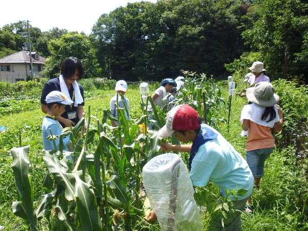 | ●トウモロコシの収穫 6月の苗付けから約2ヶ月。たくさんの実をつけていました。 ![]() |